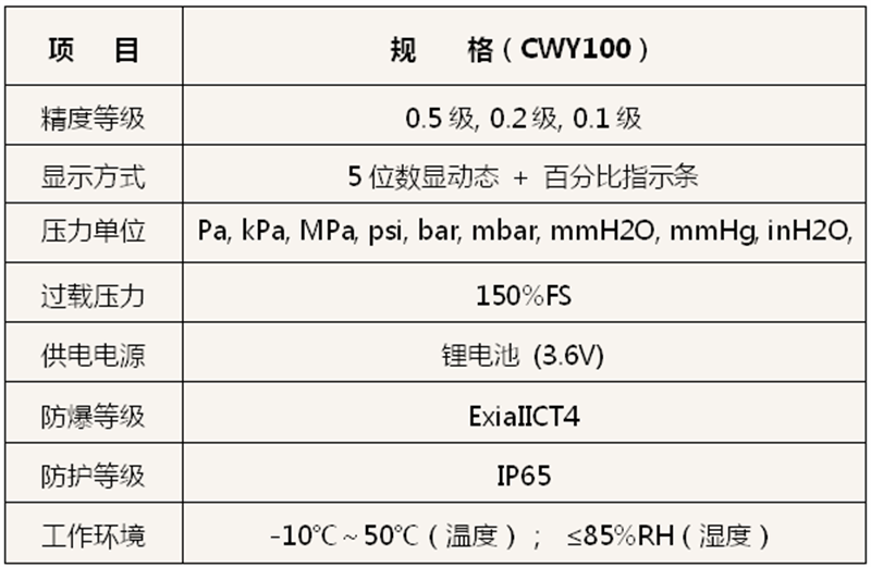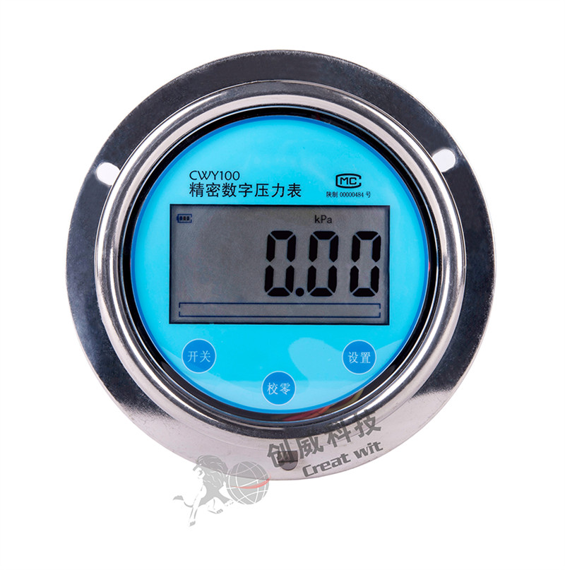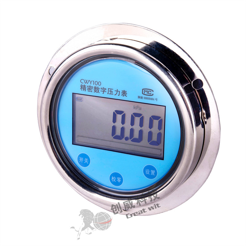 CWY100軸向精密數字壓力表,是陜西創威按照標準研制生產的高精度智能壓力測量儀表。CWY系列數字壓力表主要由壓力傳感器和信號處理電路組成,采用進口的壓力傳感器,性能優越,具有精度高、抗腐蝕性、抗沖擊、抗震動、低溫漂、高穩定性等優點;信號處理電路采用最新的超低功耗處理器、信號處理芯片及電源管理芯片組成。采用大容量高性能鋰電池供電,無需外部電源供電。該儀表外觀精致、小巧、美觀,使用操作簡單。