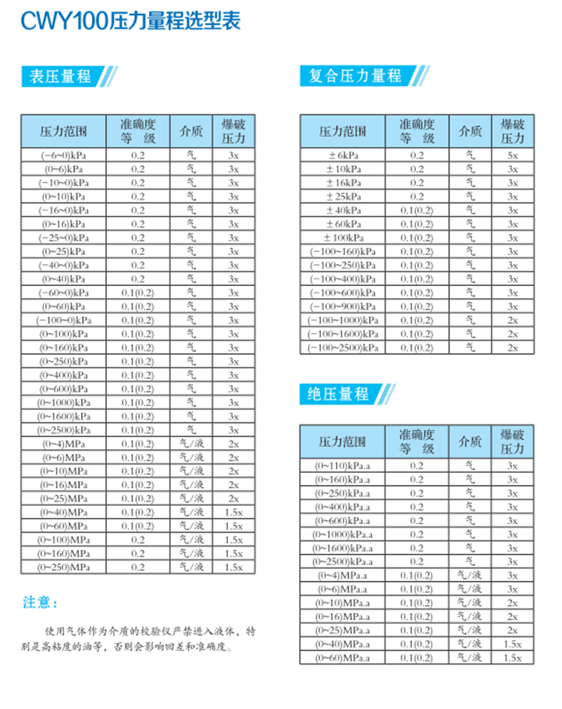 (-100~0)kPa、(0~2)kPa、(0~5)kPa、(0~10)kPa、(0~20)kPa、(0~25)kPa、(0~40)kPa、(0~60)kPa、(0~100)kPa、(0~160)kPa、(0~250)kPa、(0~400)kPa、(0~600)kPa、(0~1)MPa、(0~1.6)MPa、(0~2)MPa、(0~2.5)MPa、(0~4)MPa、(0~6)MPa、(0~10)MPa、(0~16)MPa、(0~20)MPa、(0~25)MPa、(0~30)MPa、(0~40)MPa、(0~60)MPa、(0~80)MPa、(0~100)MPa、(0~160)MPa、(0-250)MPa