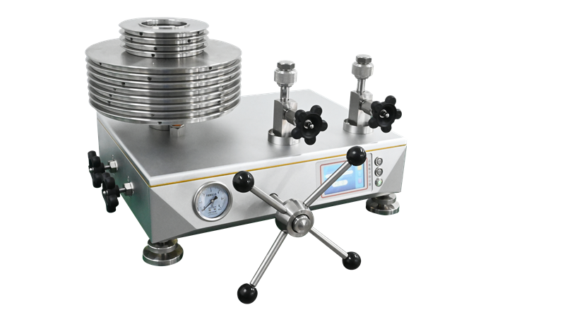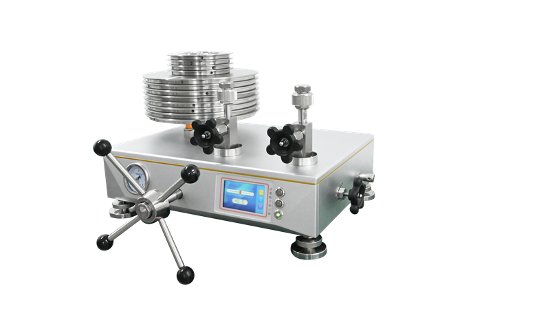 ●兩個被檢表接頭處設(shè)計(jì)有兩個截止閥,截止閥能及時關(guān)閉被檢系統(tǒng)之間的壓力。由于活塞式壓力計(jì)在加減砝碼時,必須減壓將活塞降下來,而被檢精密壓力表、壓力變送器、傳感器等和系統(tǒng)之間若不能被截止,表中的壓力會隨著活塞升降而升降,則考核不出被檢表的回程誤差,特意設(shè)計(jì)的壓力轉(zhuǎn)換閥,在關(guān)閉時,可不用砝碼單獨(dú)工作,即活塞壓力計(jì)臺子可作為壓力泵或壓力源獨(dú)立使用。