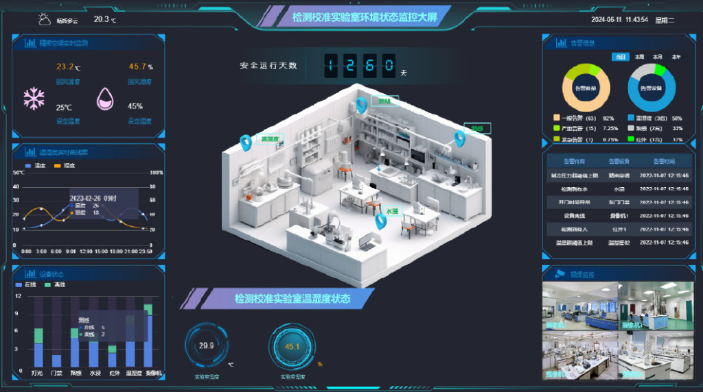 檢測校準實驗室環境狀態監控系統可集成溫濕度、大氣壓、光照、粉塵、甲烷、氮氣、二氧化碳、煙霧等多種監測類型、同時支持接入第三方設備。