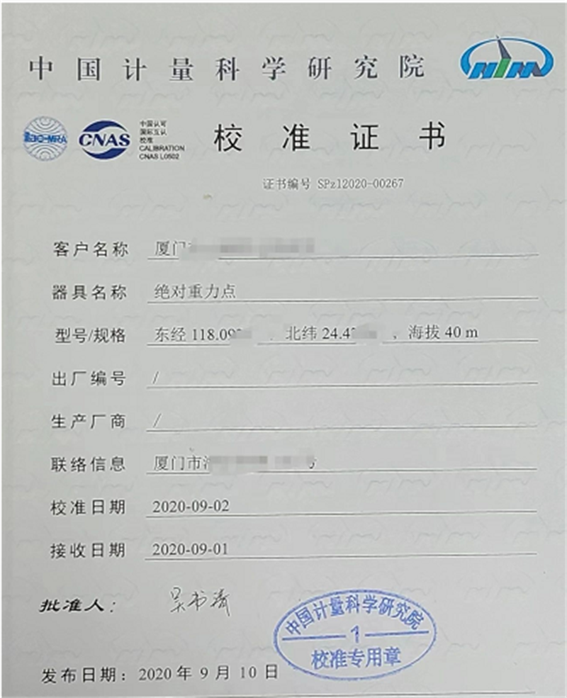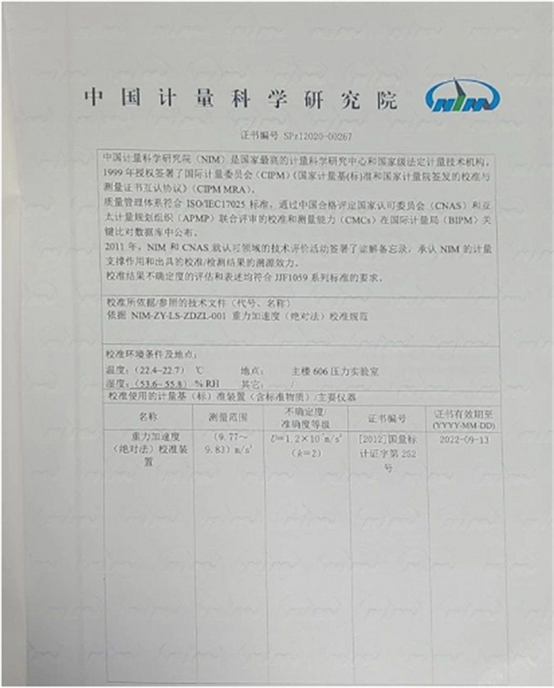 我們以創威公司廈門某客戶為例。2020年,廈門某技術機構購買了創威公司3臺0.005級的活塞式壓力計,其中有1臺氣體真空活塞式壓力計、2臺全自動活塞式壓力計,量程區間為-0.1~60MPa。同時全權委托創威公司對其實驗室進行重力加速度的實地測量,并出具國家機構的測試校準證書。
